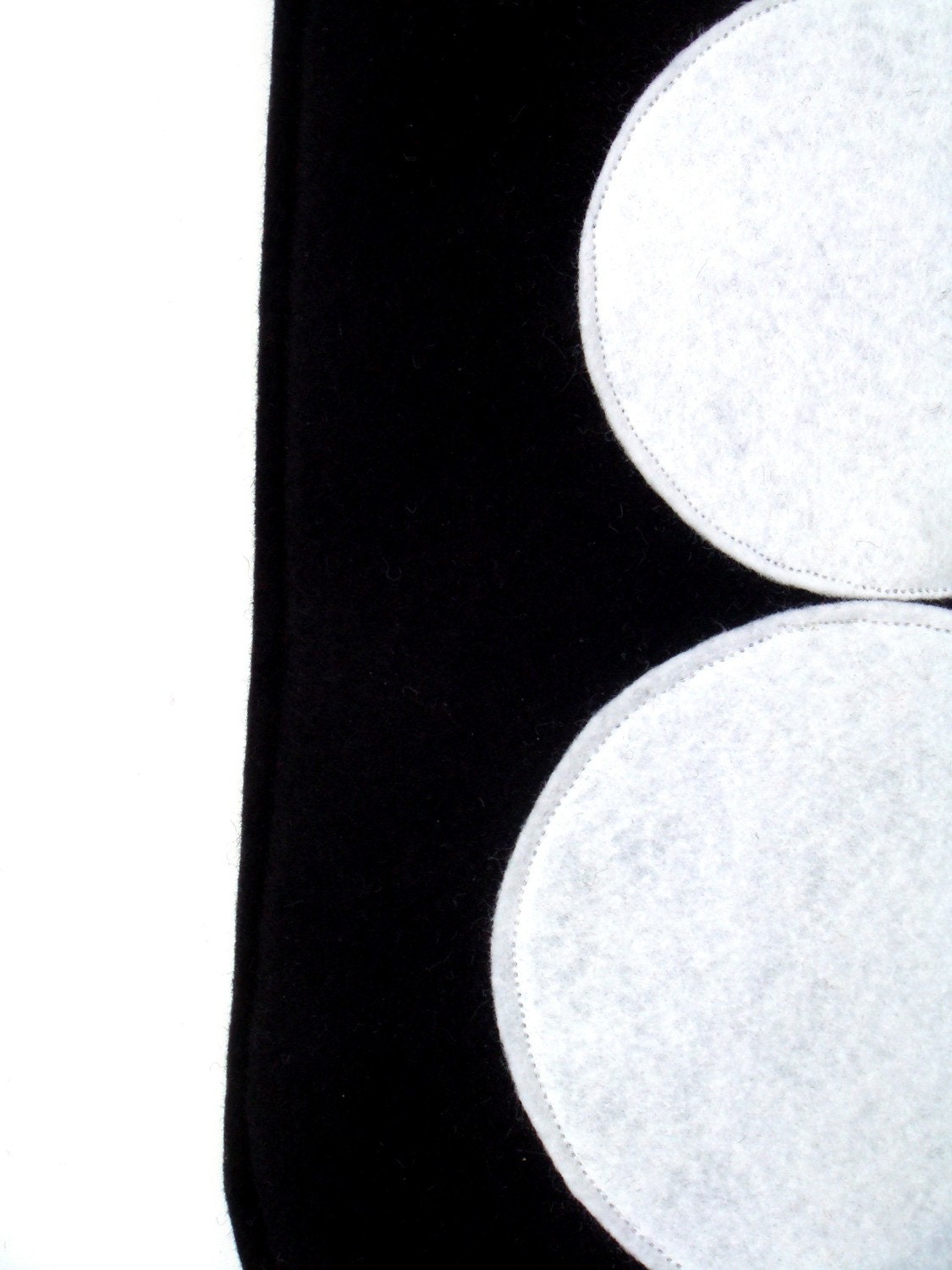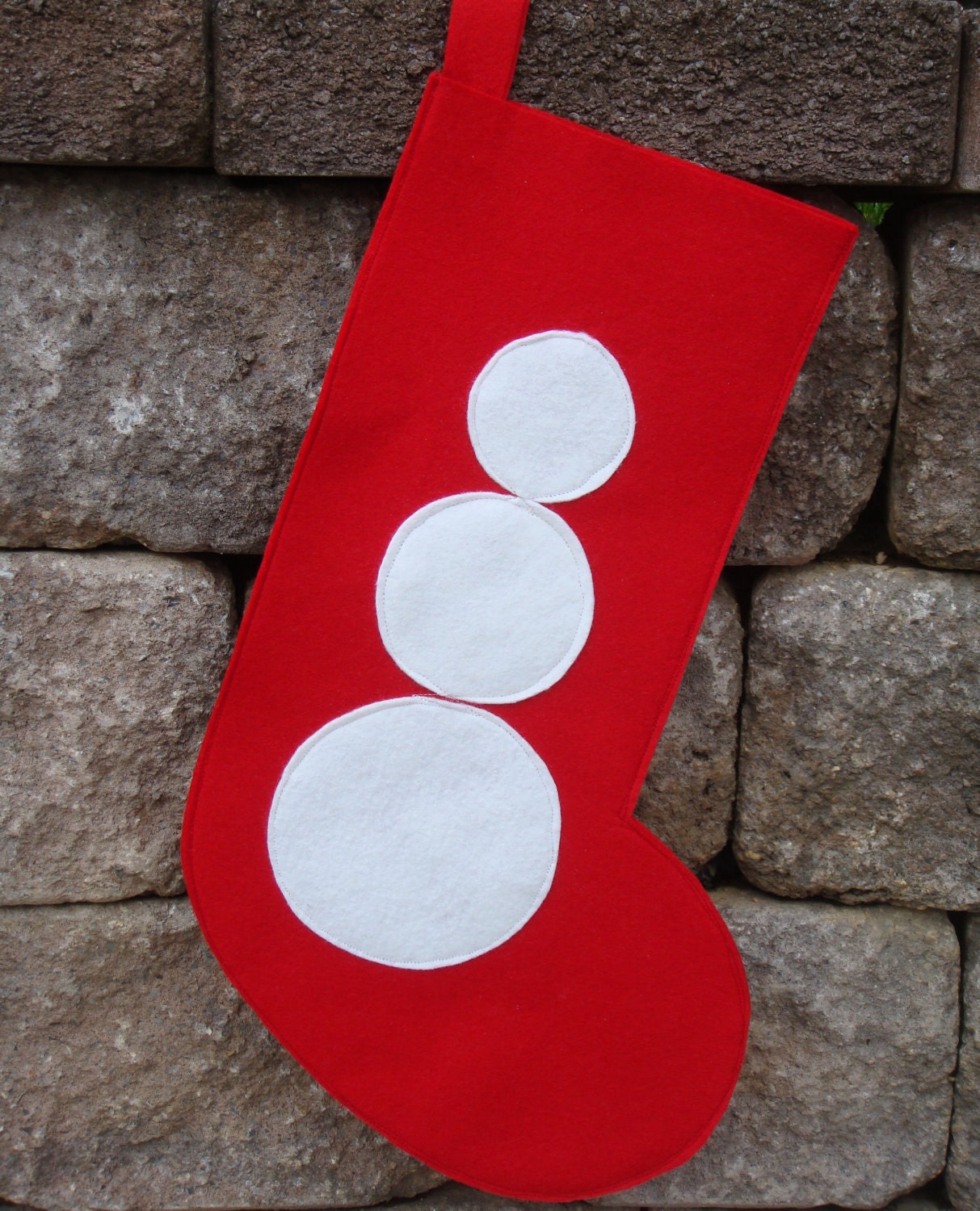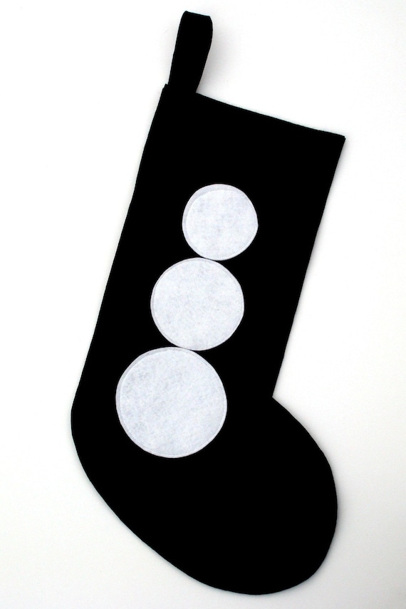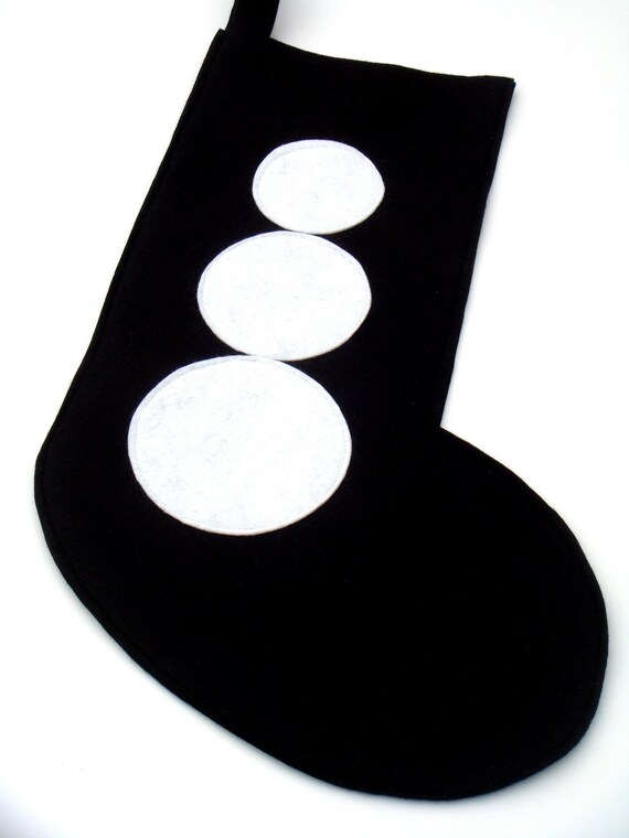 This wool felt stocking is made of thick black wool felt, and is embellished with a white wool felt snowman. The snowman has been machine sewn.